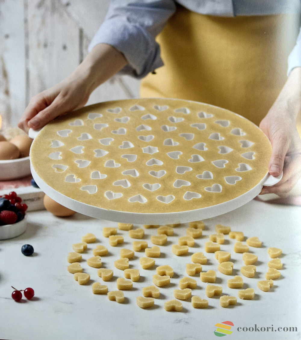 A szivecskés 30cm átmérőjő, műanyagból készült tészta kiszúró rács segítségével leegyszerűsödik a kerek, édes vagy sós pite tetejére kerülő szép, szabályos rács elkészítése, az eredmény pedig szívmelengető.