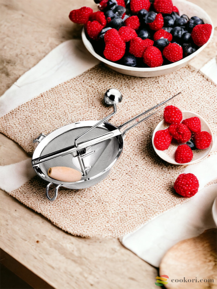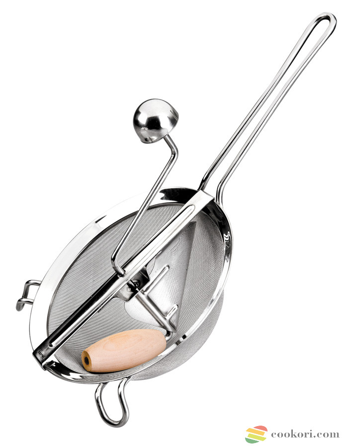 Rozsdamentes fémből készült, 20cm átmérőjű, nagyon sűrű szövésű hálóval ellátott gyümölcs passzírozó, kiválóan alkalmas apró magvas gyümölcsök, pl. málna pépesítésére, a mag nem megy át a szűrőn. Teljes hossza 40cm. Mosogatógépben mosható.