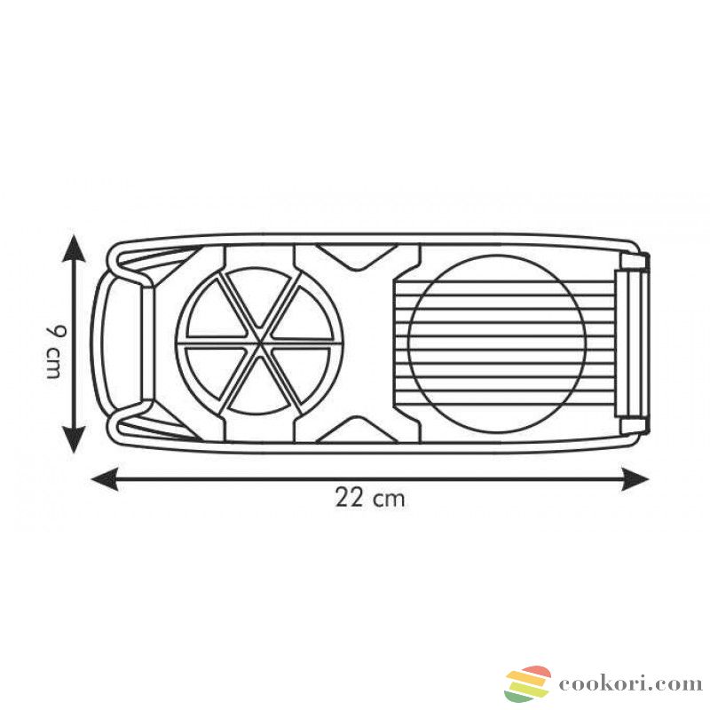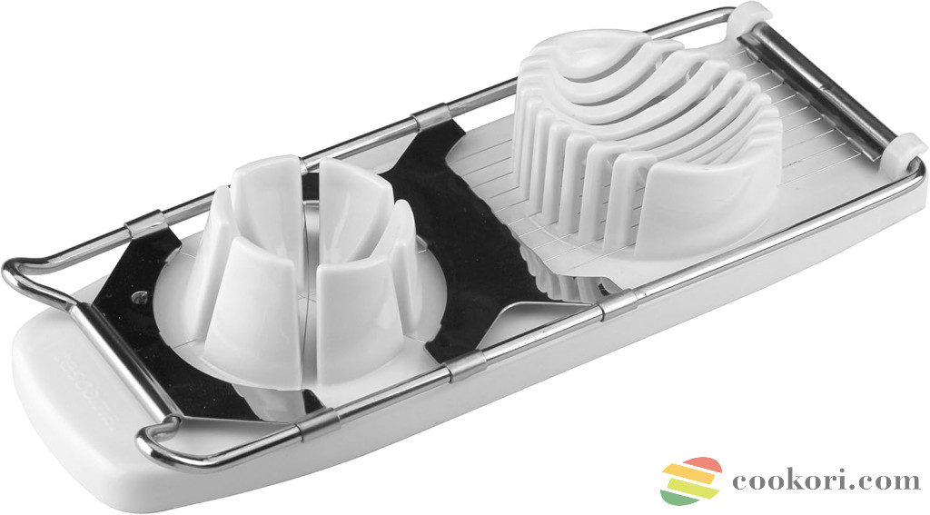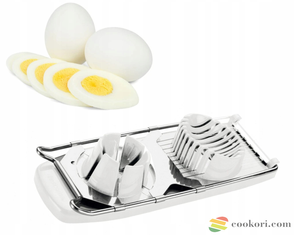 22cm hosszú és 9cm széles műanyag többfunkciós tojás szeletelő, rozsdamentes acél pengékkel. Egyrészt 10 egyforma szeletre, másrészt 6 cikkre szeli egy mozdulattala tojást de mozarellát gomba aprításra is alkalmas. Mosogatógépben mosható.