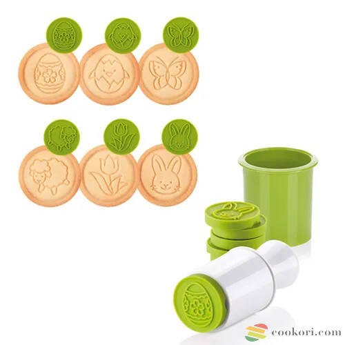 A gyerekek imádni fogják a keksz készítést és az elfogyasztást egyaránt. Egyedi, kedves 6cm átmérőjű kekszek készíthetők ezzel a sütipecsét készlettel, amely tartalmaz egy kiszúrót, 6db különféle könnyen cserélhető, szilikon húsvéti/tavaszi pecsétet, melyek a pecsételő nyomóházában tárolhatók, így nem szóródnak szanaszét. Mosogatógépben mosható.