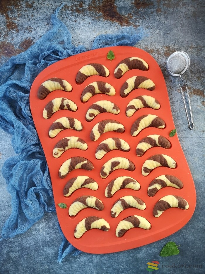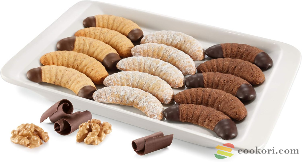 Recept ajánlat: 120gr liszt, 95gr vaj, 40gr porcukor, 55gr darált dió, 1 tojás sárgája, 1tk vaníliás cukor. Gyúrjuk össze a hozzávalókat és pihentessük éjszakán át a hűtőbe. Másnak nyomkodjuk a tésztát a mélyedések pereméig és süssük 20percig 150C fokon. Készülhetnek akár kakaós, citromos, vagy csokiba mártott változatban is.