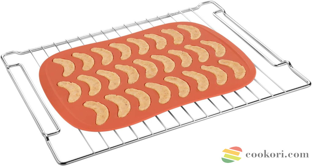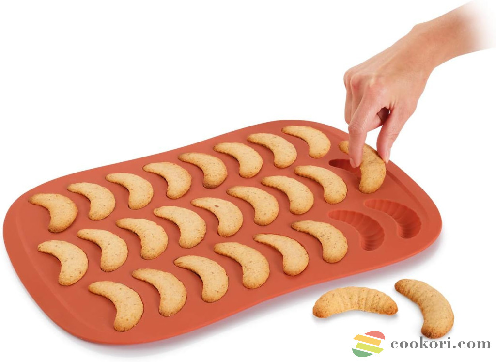Kifli készítését szolgáló 39x27x1cm-es sütőforma, 25db 7cm-es mélyedéssel, melyből könnyen kifordulnak a megsült kiflik. A sütőforma magas minőségű szilikonból készült, mely 230C fokig megőrzi minőségét. Első használat előtt fújjuk be sütőspray-el, a sütőbe mindig rácsra vagy tepsire helyezve tegyük be, amikor már a tészta benne van.Mosogatógépben is mosható és minden sütőben használható.