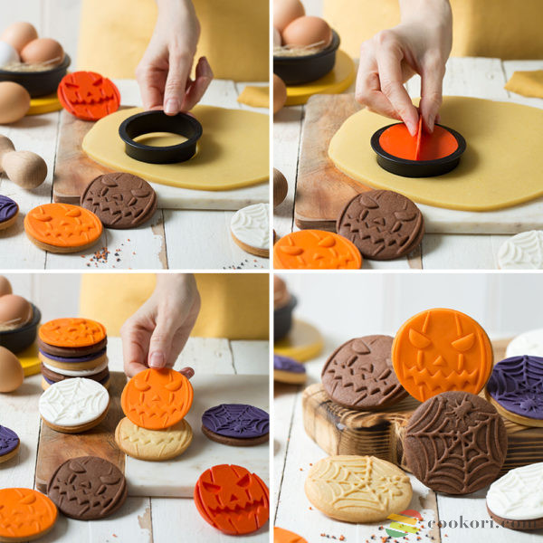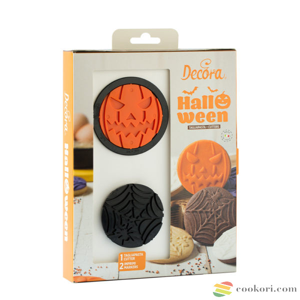 A Decora újdonsága ez a 3db-os készlet, amely tartalmaz egy 6,5x2,2cm-es kör alakú kiszúrót valamint 2 db 6,5cm-es Halloween pecsétet keksz, mézes, fondant mintázásra. Díszítsük a kekszet utólad fondanttal, színező spray-vel vagy lüszter porral.
