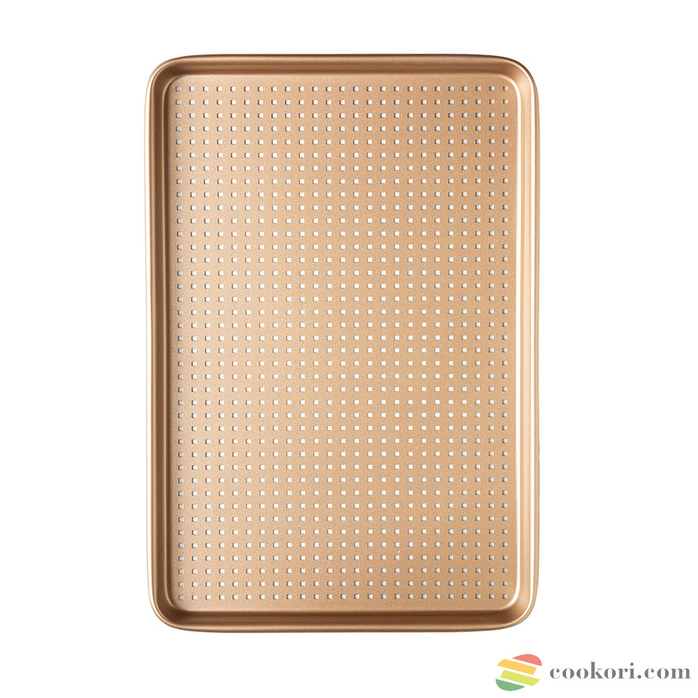 Kiváló minőségű lyukacsos, tapadásmentes fém tepsi, ideális édes és sós ételek sütéséhez. A perforált felület tökéletessé teszi a légkeverős sütést, ideális kekszek, pogácsák, piték és egyéb kelesztett termékek elkészítéséhez. A lyukak lehetővé teszik a sütő légkeveréses ciklusának szabad áramlását, elérve az ételnek a serpenyővel érintkező részét is az egyenletes sütéshez, kívül-belül egyaránt, pöttyös mintázatot kölcsönözve a keksz vagy kelt tészta aljának. Mérete 39,7x27cm, mélysége 2,4cm.