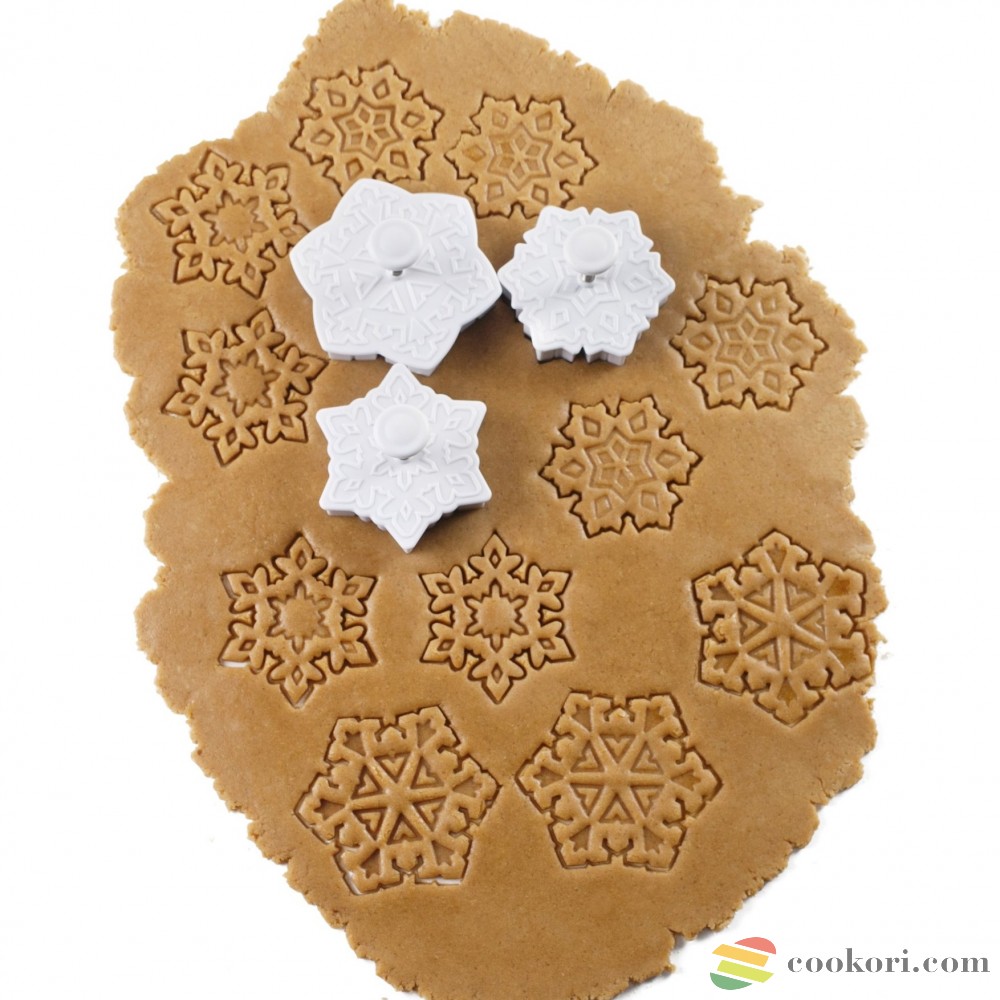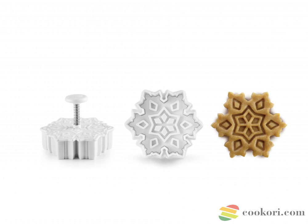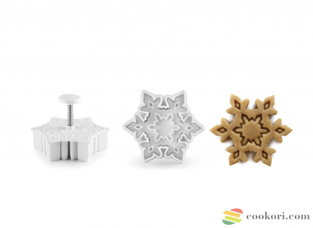 Műanyagból készült 3 db-os, rugós hópehely kiszúró és mintázó készlet keksz, mézes, fondant szaggatáshoz és mintázáshoz. A kiszúrók mérete 5,5-7cm.