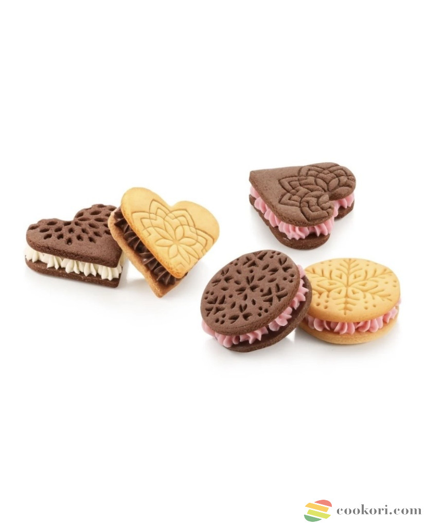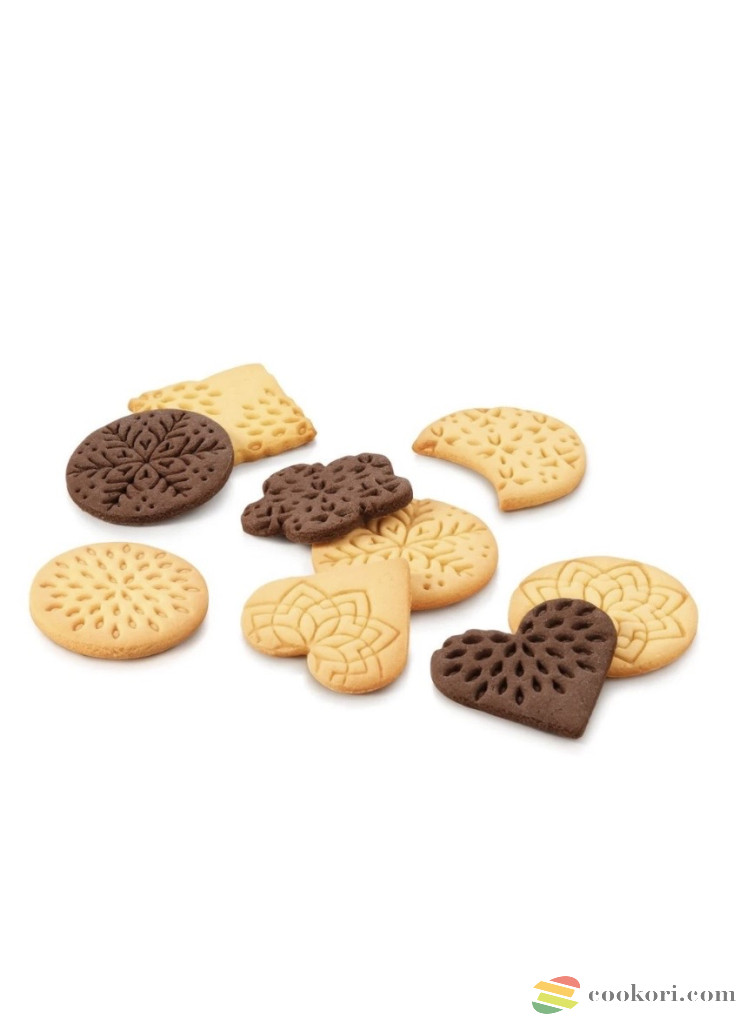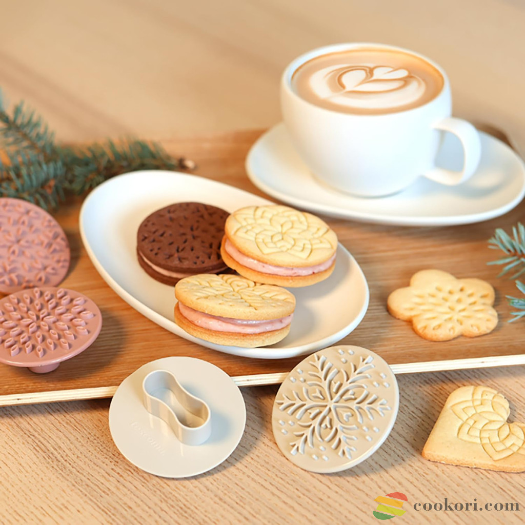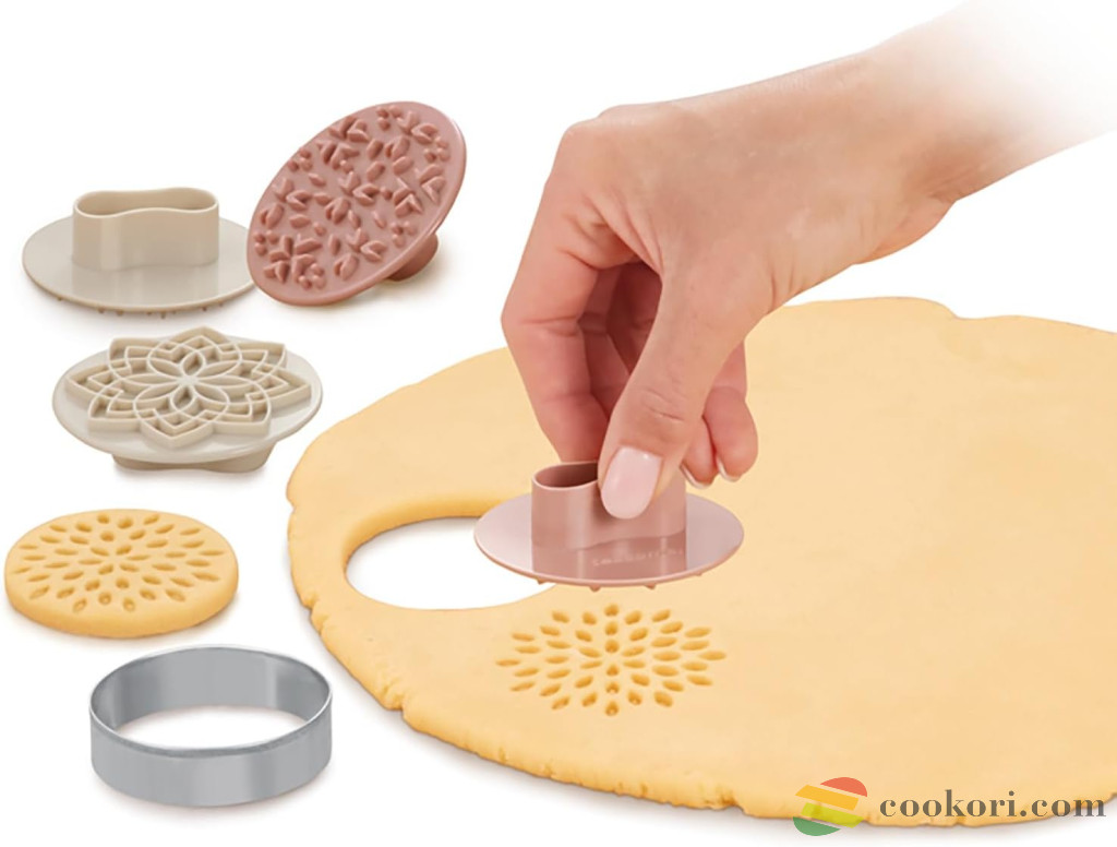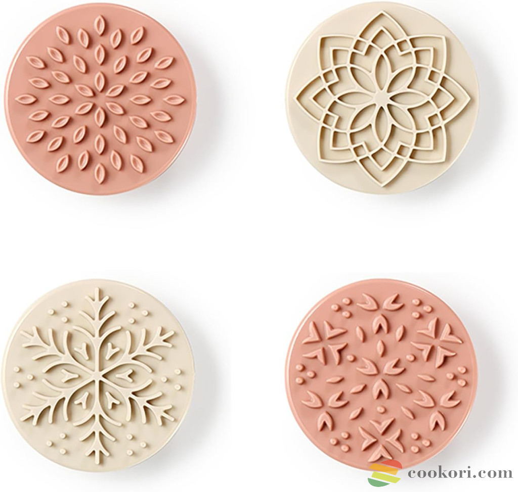 Kítűnő minőségű műanyagból készült díszítő pecsét készlet keksz, mézeskalács tészta kiszúrás előtti díszítéséhez. A készlet 4db 6cm átmérőjű nyeles díszítő korongot tartalmaz.