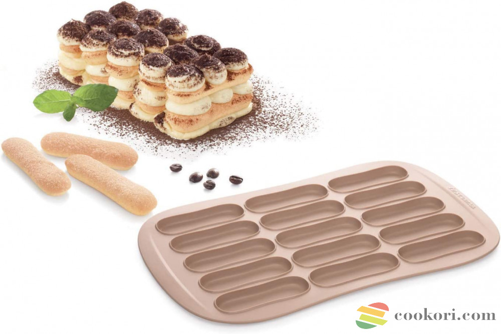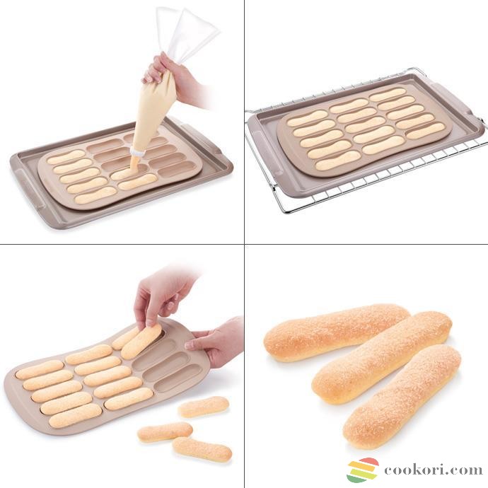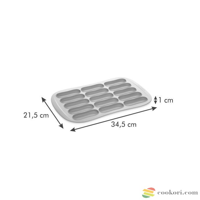 A Tescoma újgenerációs szilikon családjába tartozik ez a 34,5x21,5cm-es, 1cm magas babapiskóta és/vagy eklerfánk sütőforma, melyben egyszerre 15db, 9x3cm-es babapiskóta süthető. A babpiskóta ideális teásütemény, vagy különféle ízesítésű tiramisu hozzávalóként szolgálhat, akár gluténmentes változatban is.  Sütőrácsra helyezve a sütőforma 230C-ig használható gáz, elektromos és légkeveréses sütőben egyaránt. Mosogatógépben mosható.