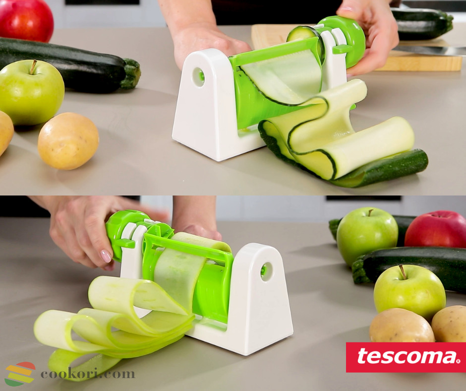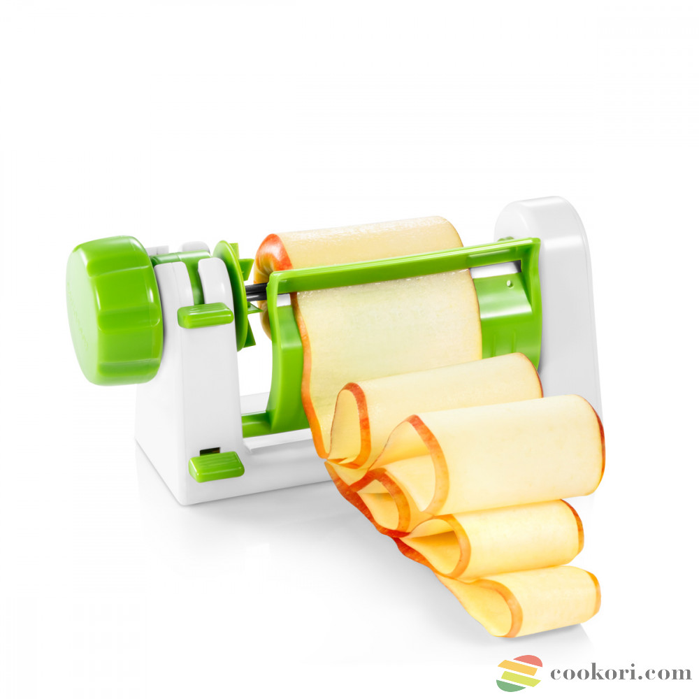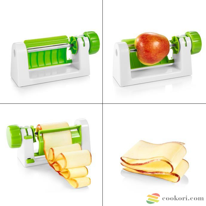Praktikus szeletelő hosszú, vékony gyümölcs és zöldség szeletekhez. Kiválóan alkalmas például cukkini, uborka, burgonya, édesburgonya, jégcsapretek, alma és hasonlók szeleteléshez amelyek aztán vegán lasagné, vagy tekercselve zöldség pite vagy savanyúság alapját képezik majd. A szeletelő teste műanyag és fém, pengéje éles, rozsadmentes fém. Használatát a következő videó szemlélteti: