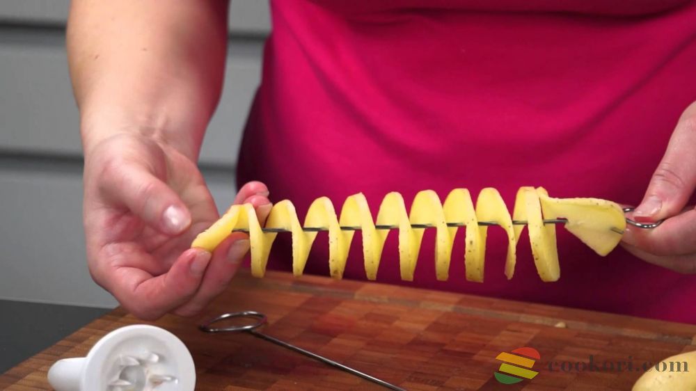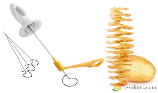 Burgony spirálozó készlet 4 rozsdamentes acél pálcával, műanyag fogóval és spirálozóval. A krumpli spirált pálcástól merítjük forró olajba és azon sütjük ki, de oliva olajjal meglocsolva, fűszerezve 200C fokon sütőben is kisüthetjük. Használatát a következő videó mutatja be: