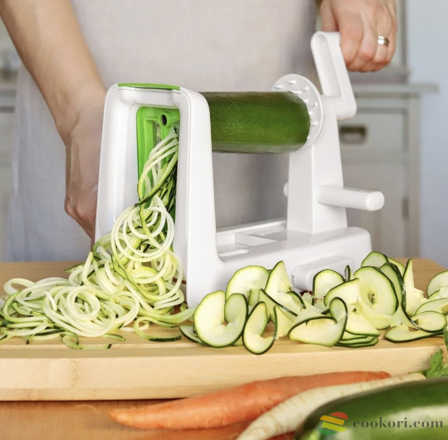 A Tescoma rozsdamentes fémből és magas minőségű műanyagból készült zöldség és gyümölcs spirálozójával könnyedén készíthetőek alacsony szénhidráttartalmú gyors, ízletes, tápláló és látványos ételek zöldségből, lehetőséget nyitva számos kedvencünk újragondolására zöldségből. 3 cserélhető pengéje által burgonya, édesburgonya, répa, cukkini, cékla, uborka, alma, körte vastag- valamint vékony spagetti és szalag alakú zöldség spirálok faraghatók gyorsan és könnyedén. A zöldségek leve egy tálkába gyűl, amint a spirálok is. A spirálozó mérete 25,5x14cm, magassága 18cm. Használatát a következő videó szemlélteti: